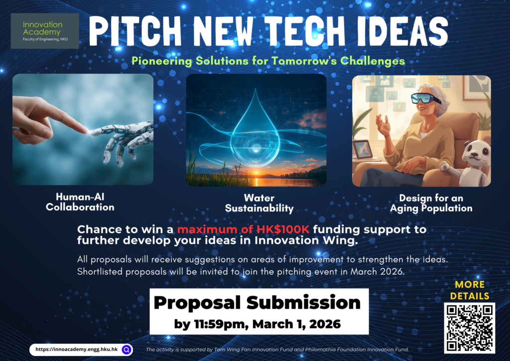 • A maximum of 3 proposals will be selected as winners and awarded a cash prize of HK$1,200. The winning proposals can further obtain a maximum of HK$100K funding support from the “Funding Scheme for student projects / activities by Tam Wing Fan Innovation Fund and Philomathia Foundation Innovation Fund” for development, subject to the approval by the Innovation Academy Steering Committee.