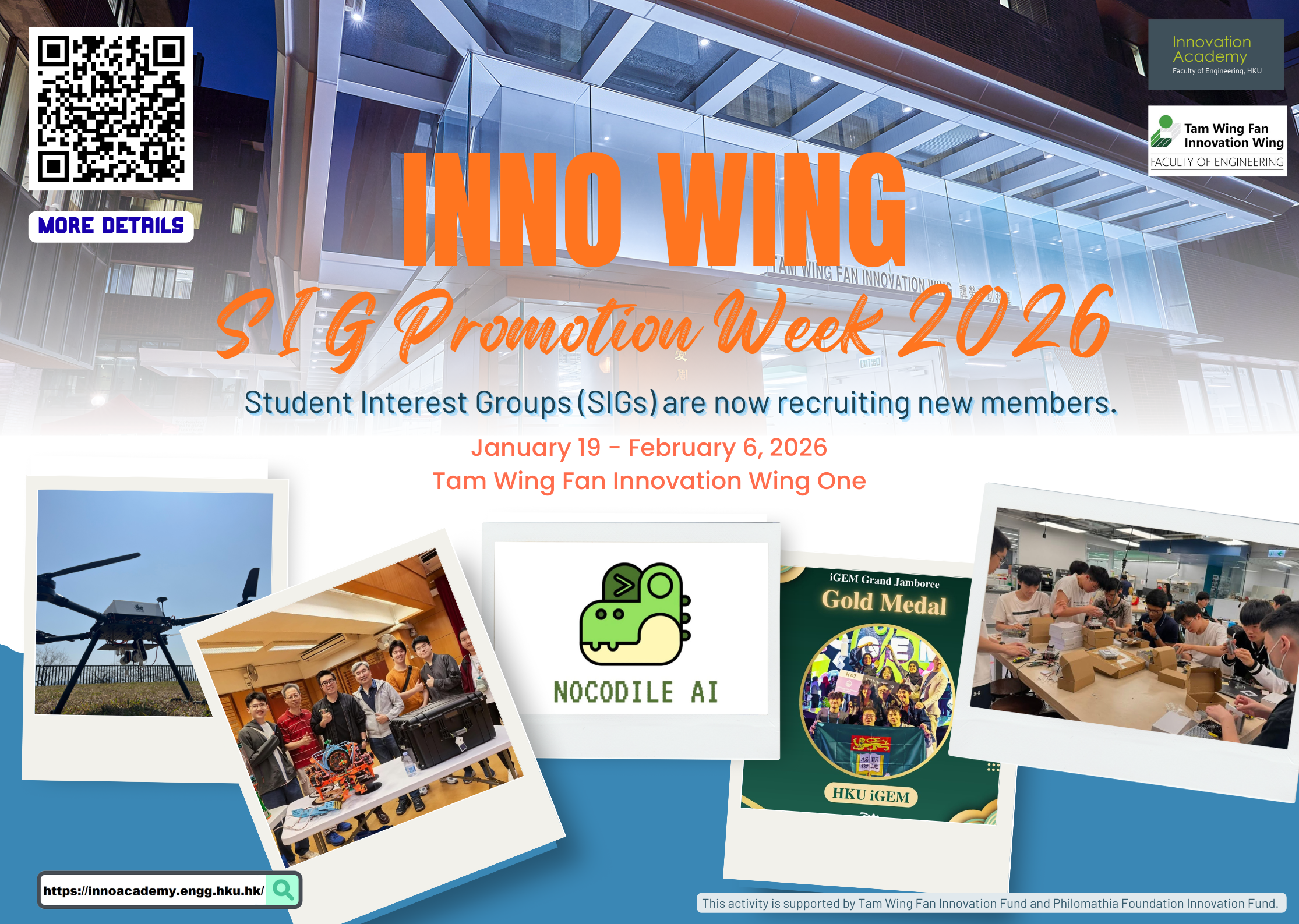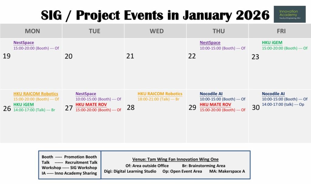 Inno Wing Carnival is an event for all members of the HKU community not only to gain better understanding of Innovation Wing, but also to know more about our student interest groups (SIGs) and the new initiatives supported by the Innovation Wing and Innovation Academy. It provides an opportunity for the student teams to showcase their projects in a fun and interactive way, to promote their projects and to foster collaboration. A series of activities will be scheduled for the Carnival, including SIG recruitment events, workshops and sharing sessions conducted by SRAs, hands-on workshops led by tutors, and more.